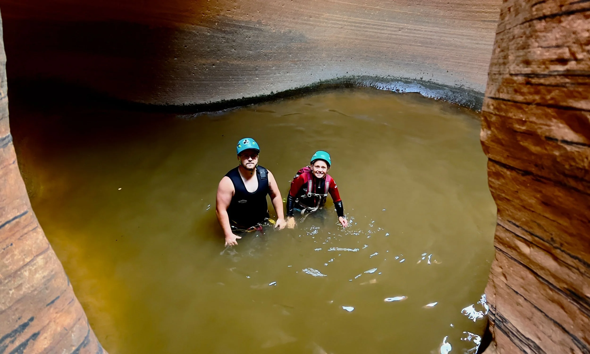Two people in water inside a canyon, wearing wetsuits and helmets, surrounded by rock walls.