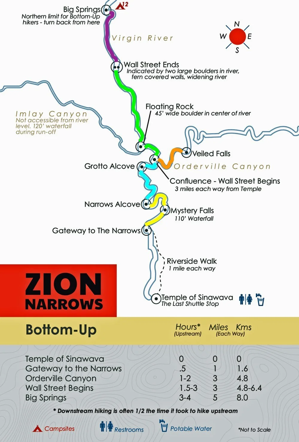 This tool is an up-to-date report of the water depth in the Narrows, designed to help hikers properly plan for their Narrows adventure. Our staff regularly hike the narrows to gather current conditions and depth levels. Use the color on the section of the map to see the corresponding depth list below. (The dotted line on the map is an entirely paved, dry path)