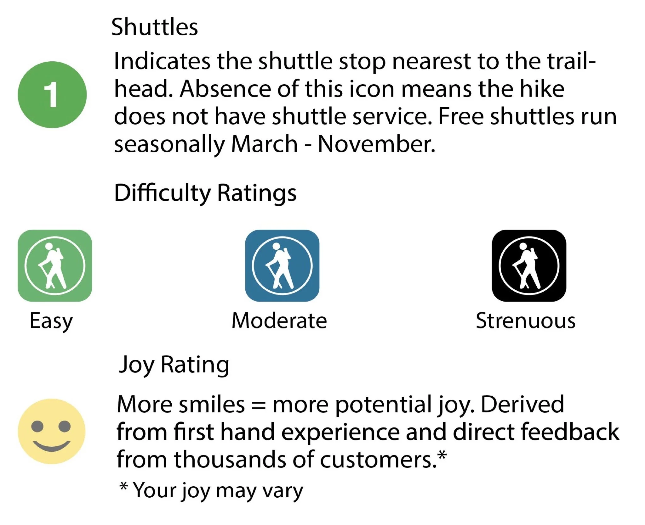 | Hiking Trail Name | Distance | Elevation Gain | Estimated Duration | Difficulty | Shuttle Stop |